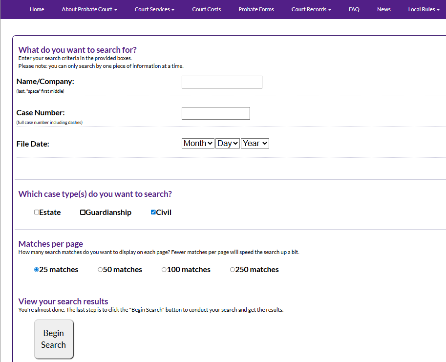 - Under “Which case type(s) do you want to search?”, check Civil.