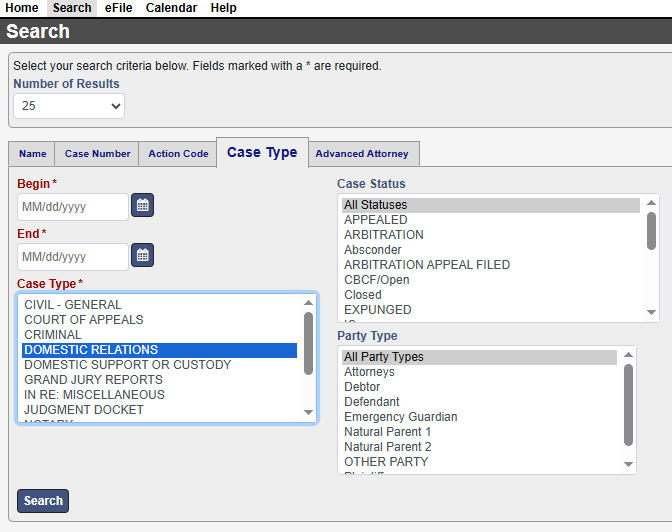 - Click Search to begin looking up court cases. The system will direct you to the case search interface.